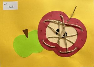 りんごの形の紙に穴があいていて、紐を入れたり、出したりします🪢
