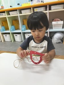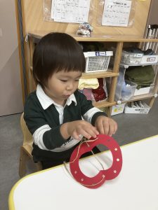 長い紐に少々苦戦しているお友達もいましたが、みんな集中して上手に紐を通すことができました👏🏻