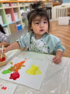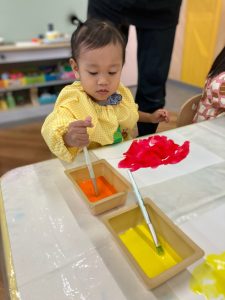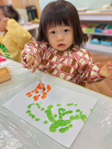 薄めの絵の具を筆につけて画用紙にポタポタ落としたり、伸ばしたりします🎨🖌️