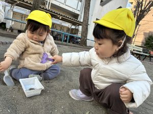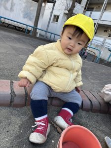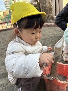 バケツをひっくり返して上から豪快に砂をこぼして遊んでいました🪣